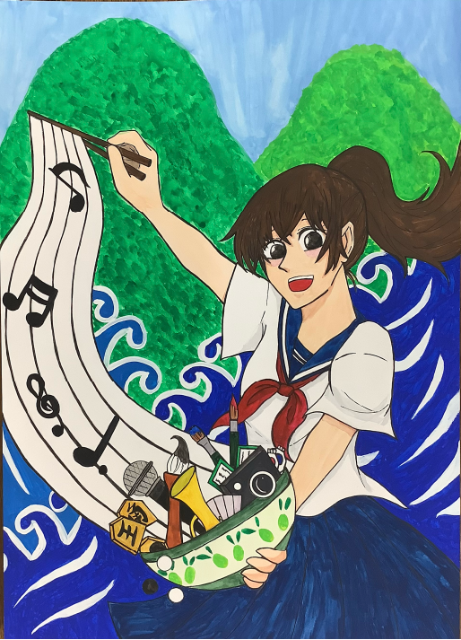 テーマが『香川』なので香川県の代表的な山や海、うどん鉢などを描きました。